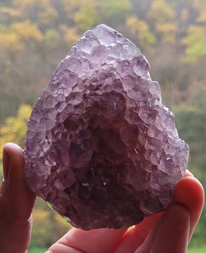 Mooie standup Amethist uit Madagaskar. Rond geslepen aan de achter en zijkant, ruwe kristallen aan de voorkant.