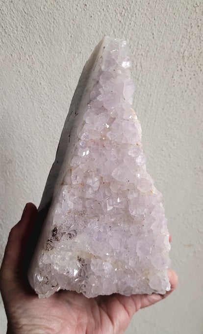 Mooie zelfstaande Amethist met kleine Calcietbolletjes. 2 zijkanten geslepen. Brazilië