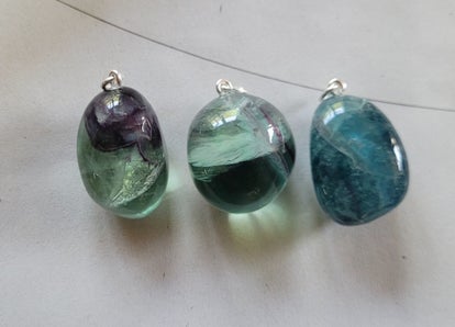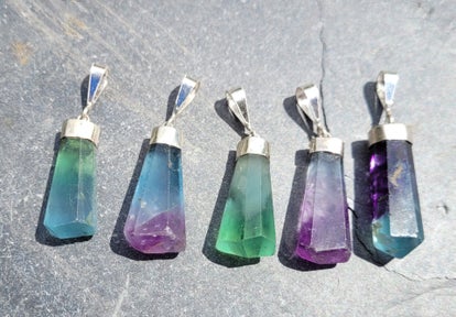 Mooie geslepen hanger Regenboog Fluoriet in zilver cap. Paars, blauw groen en combi.
