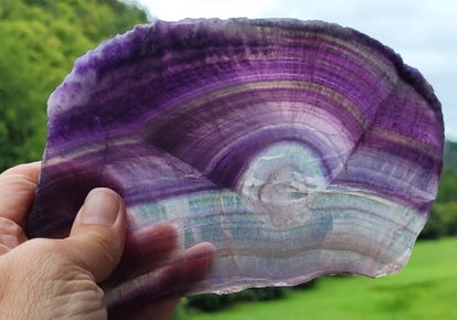 Slab Fluorite, purple transparant en green stripes. With rough sides.