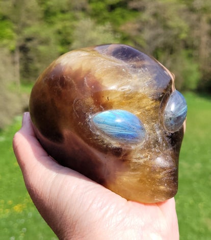Mooie grote Alien skull, Star Being van gele en donkerrode Fluoriet uit China op wat agaat/matrix (aan rechterkant te zien)