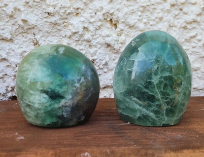 Bolle sculptuur groene Fluoriet met beide een deel blauwgrijs. Deels helder.