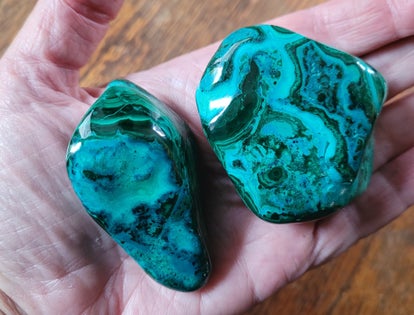 Gepolijstte stukken Malachiet met Chryssocolla. Zg. Malacholla.