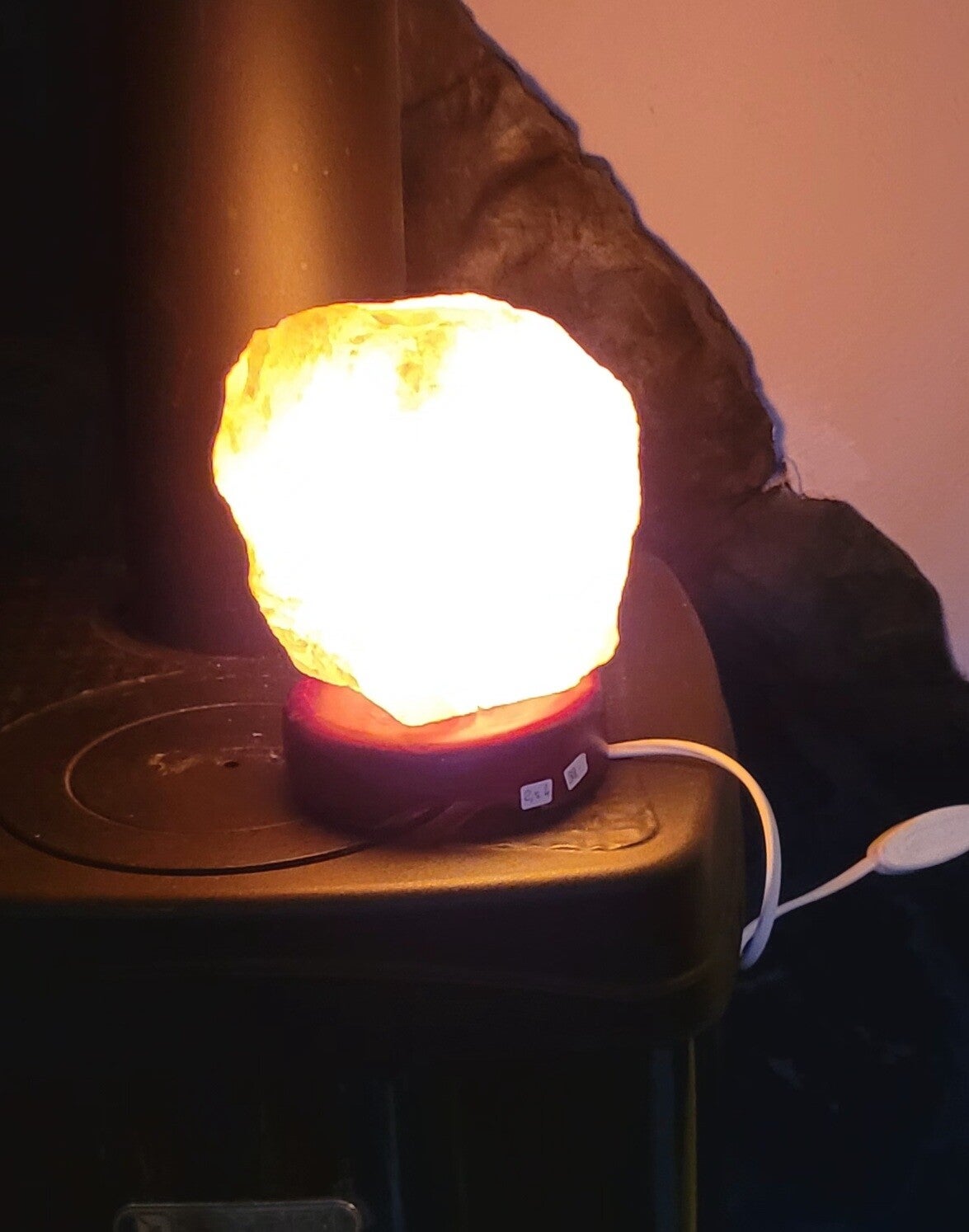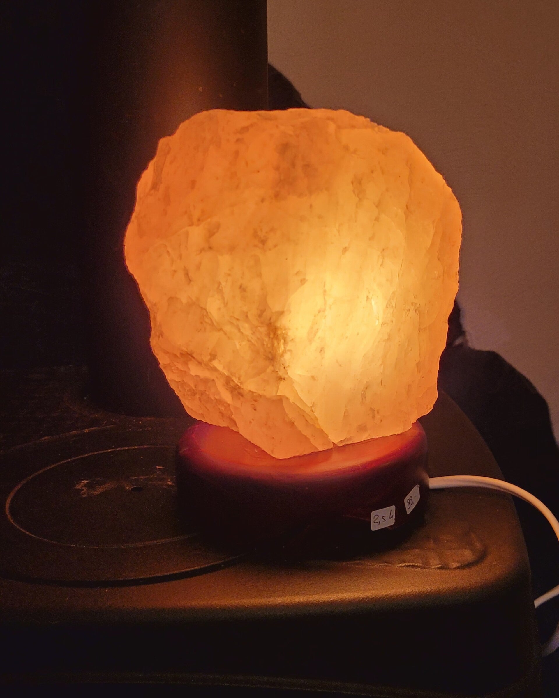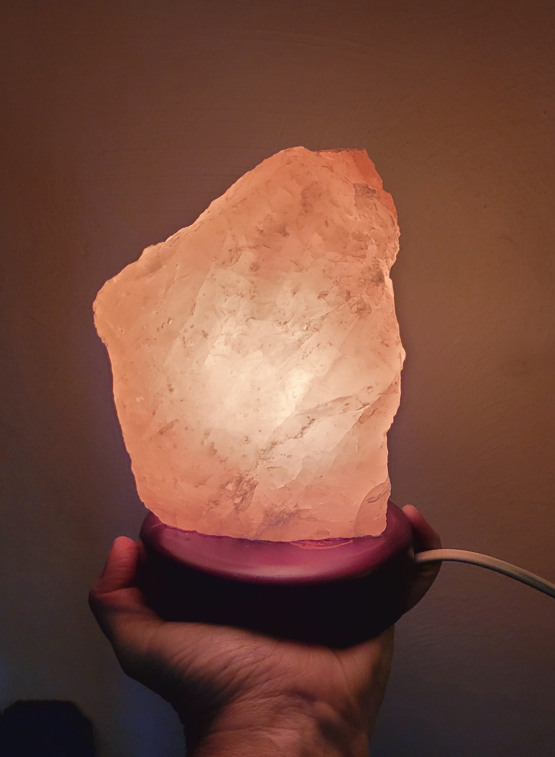 Lamp van ruwe brok Rozenkwarts, Rozekwarts op houten voet.