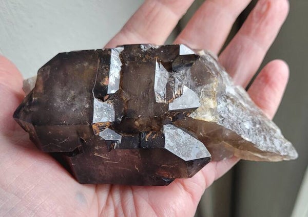 Mooie Brandberg scepter dubbeleinder Rookkwarts kristal op een ruw stuk kwarts. Elestiaalkwarts groei