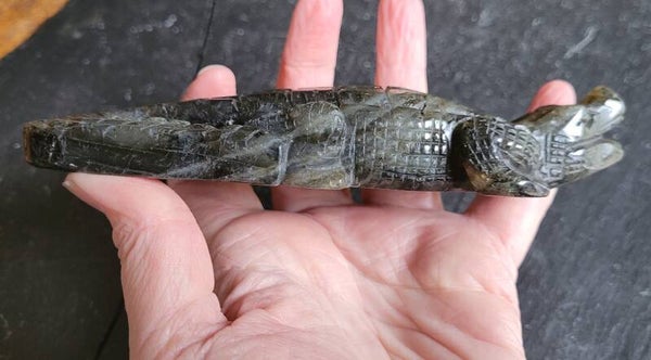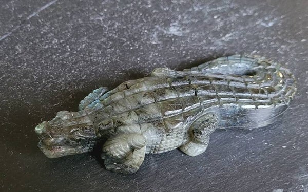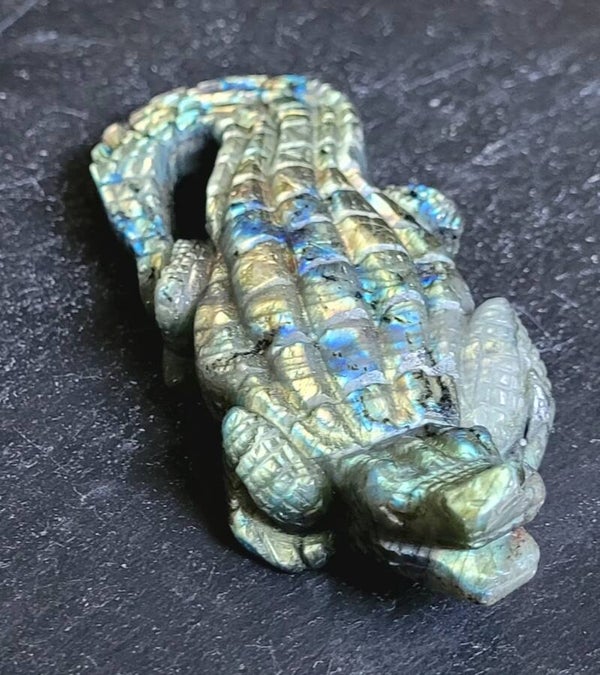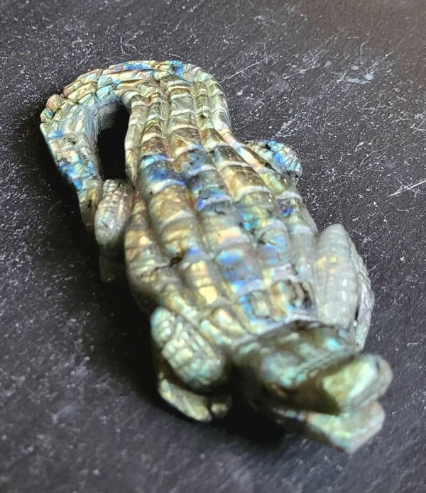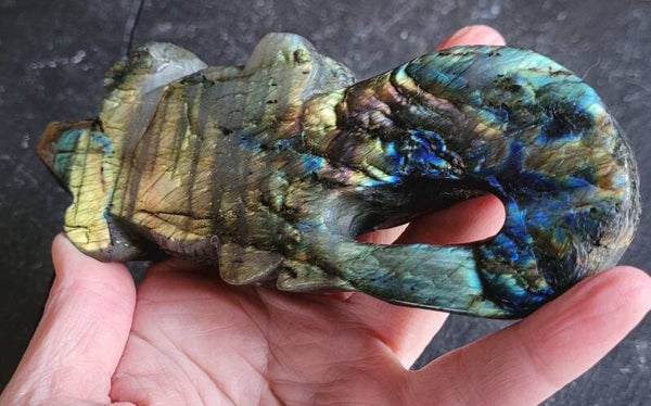 Mooie carving Labradoriet met mooie flash. Achterkant ook met flash.
