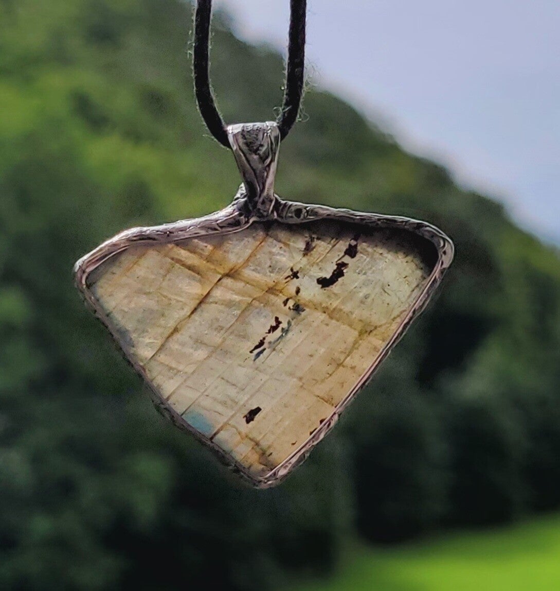 Mooie handgemaakte hanger flash Labradoriet, achterkant is ruw. Doorzichtig tegen het licht. Zilver en klein aandeel tin.