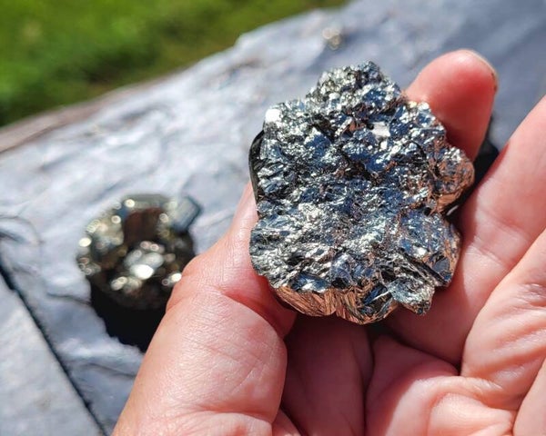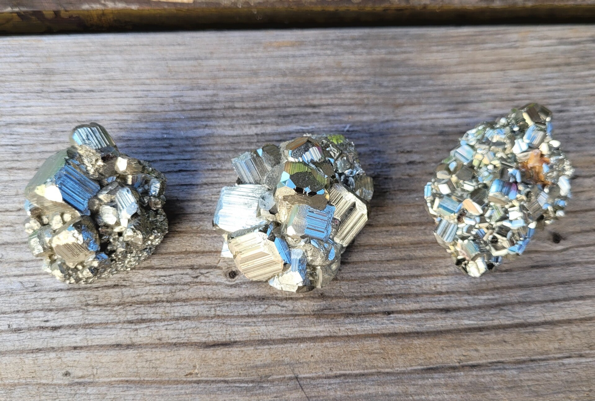 rough pieces of Pyrite with blockcrystals. Bottomside is flat.