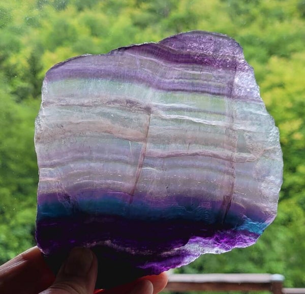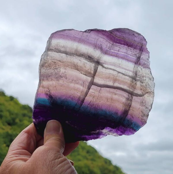 Slab Fluorite, purple transparant en deep blue stripes. With rough sides.