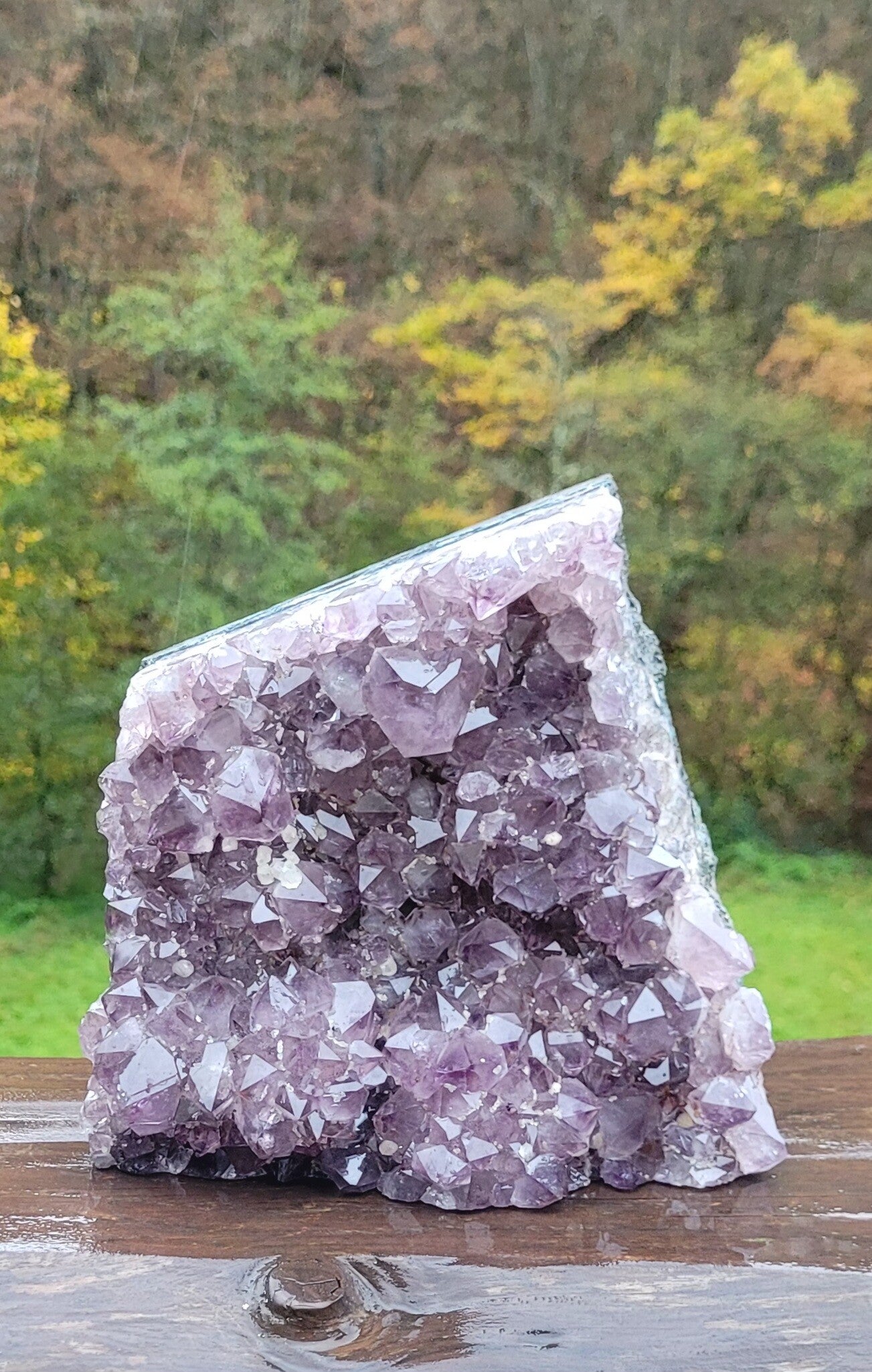 Mooie zelfstaande Amethist met kleine Calcietbolletjes. 2 zijkanten geslepen. Brazilië