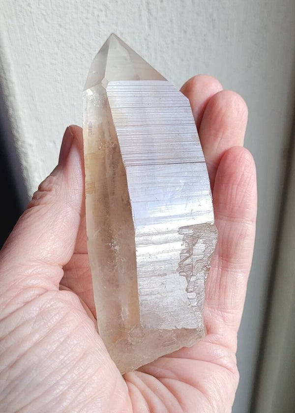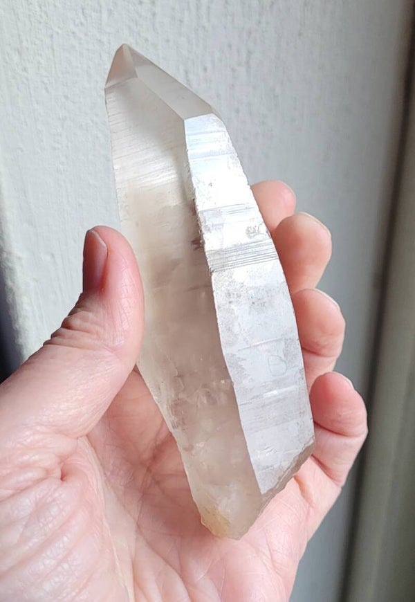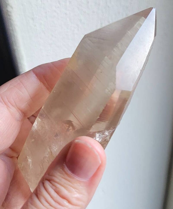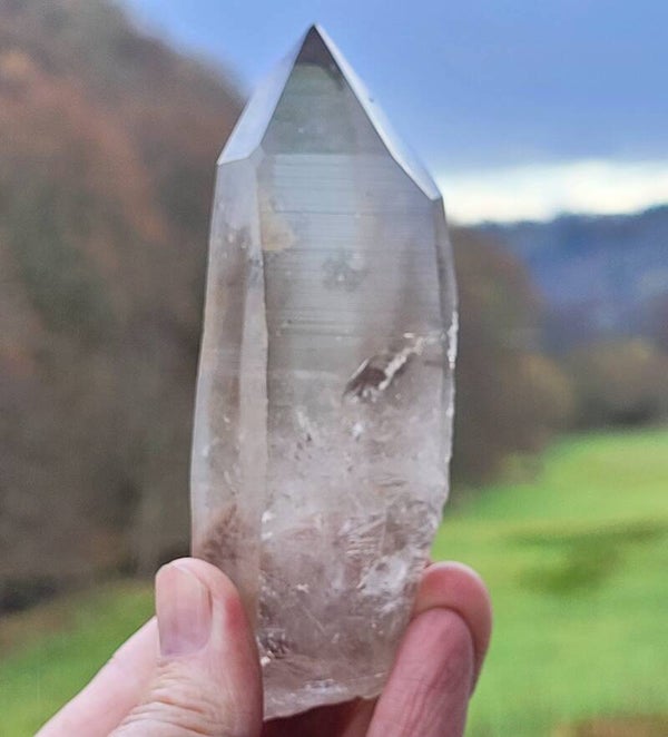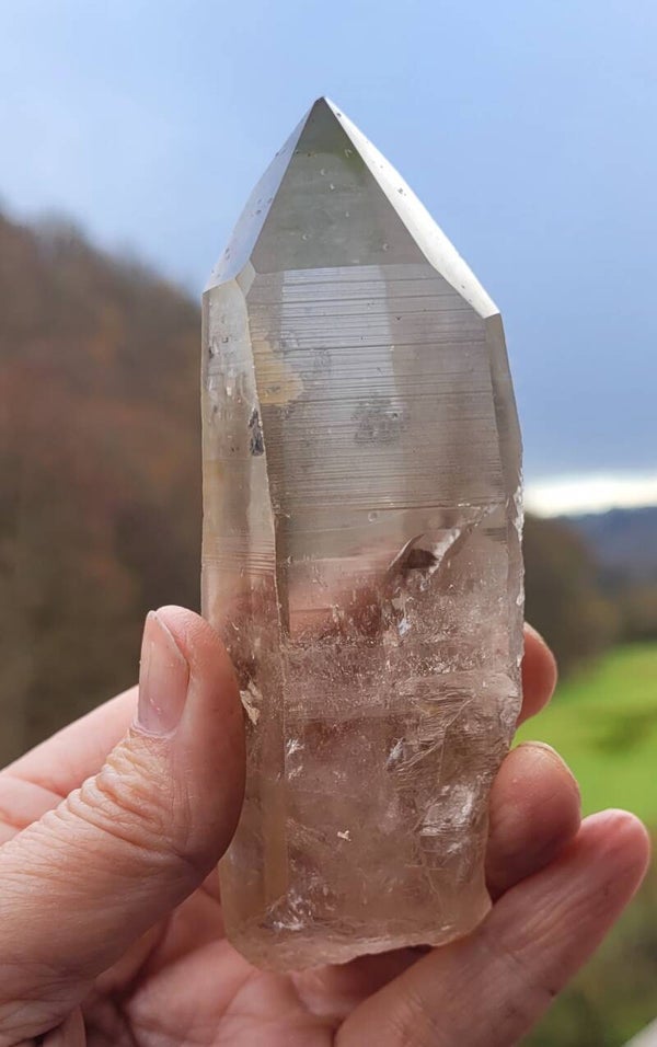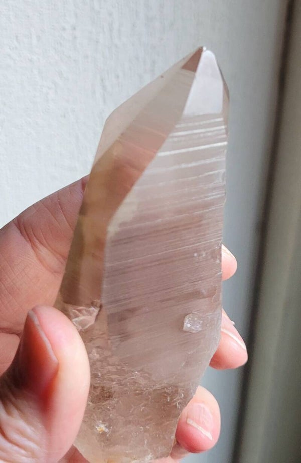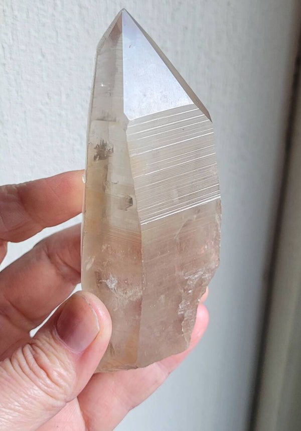 Mooi groot Laserkwarts Rookkwartskristal , zg. Lemurisch kristal door alle 'coderingen' dwarsslijntjes.