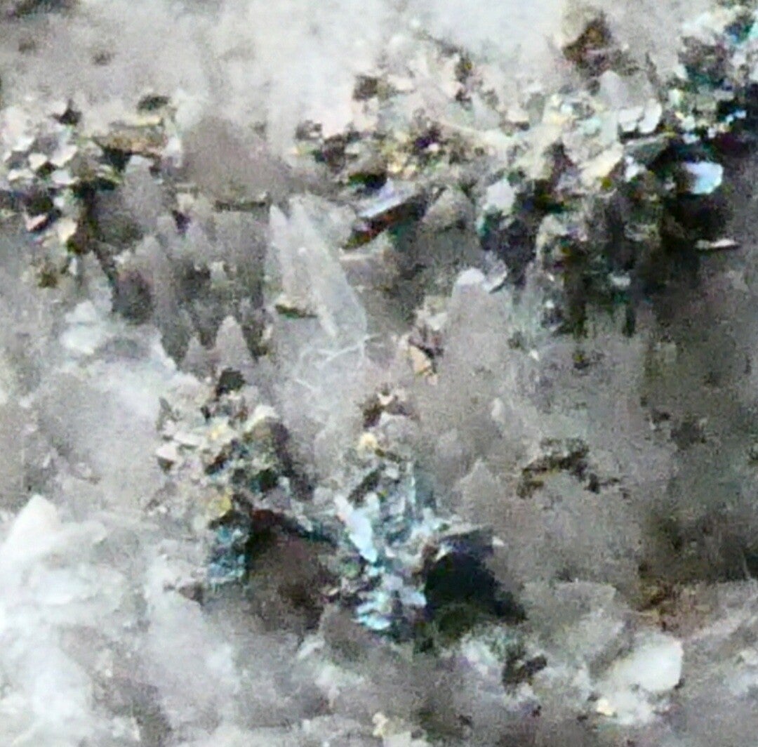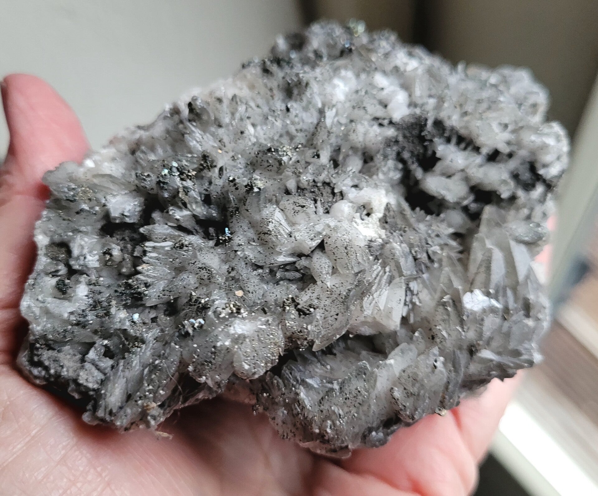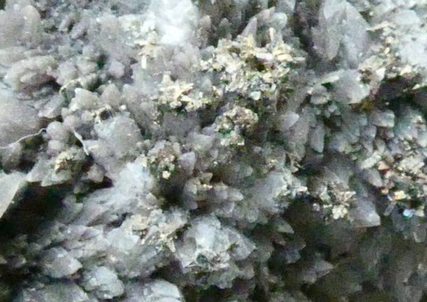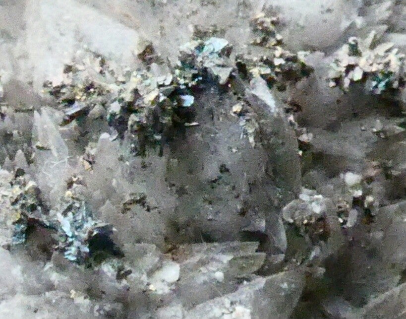Bijzonder cluster (dogtooth) Calciet kristallen met Marcasiet / Chalcopyriet blokjes en schijfjes. Ene kant donker, andere kant licht calciet.