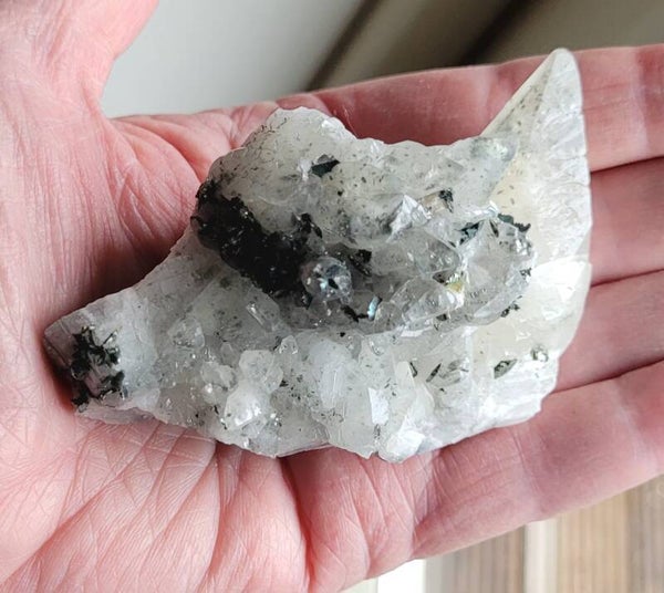 Erg mooi licht cluster (dogtooth) Calciet kristallen met Marcasiet en/ of Chalcopyriet blokjes en schijfjes.