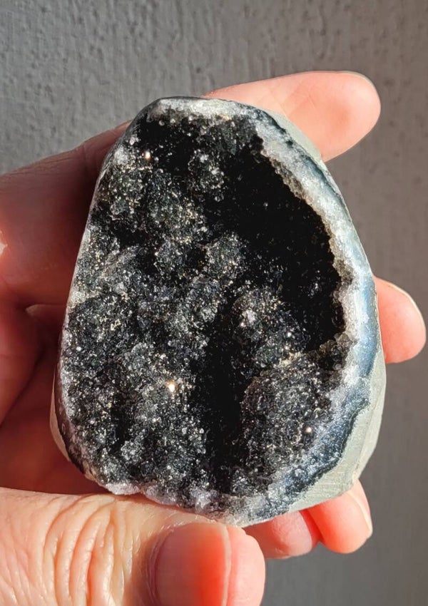 Letterlijk schitterende standup Zwarte Amethist. De donkerste vorm van Amethist. Standup is uitgezaagd uit moedergesteente met gepolijst randje.
