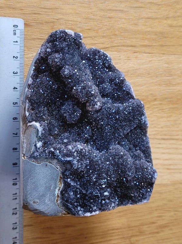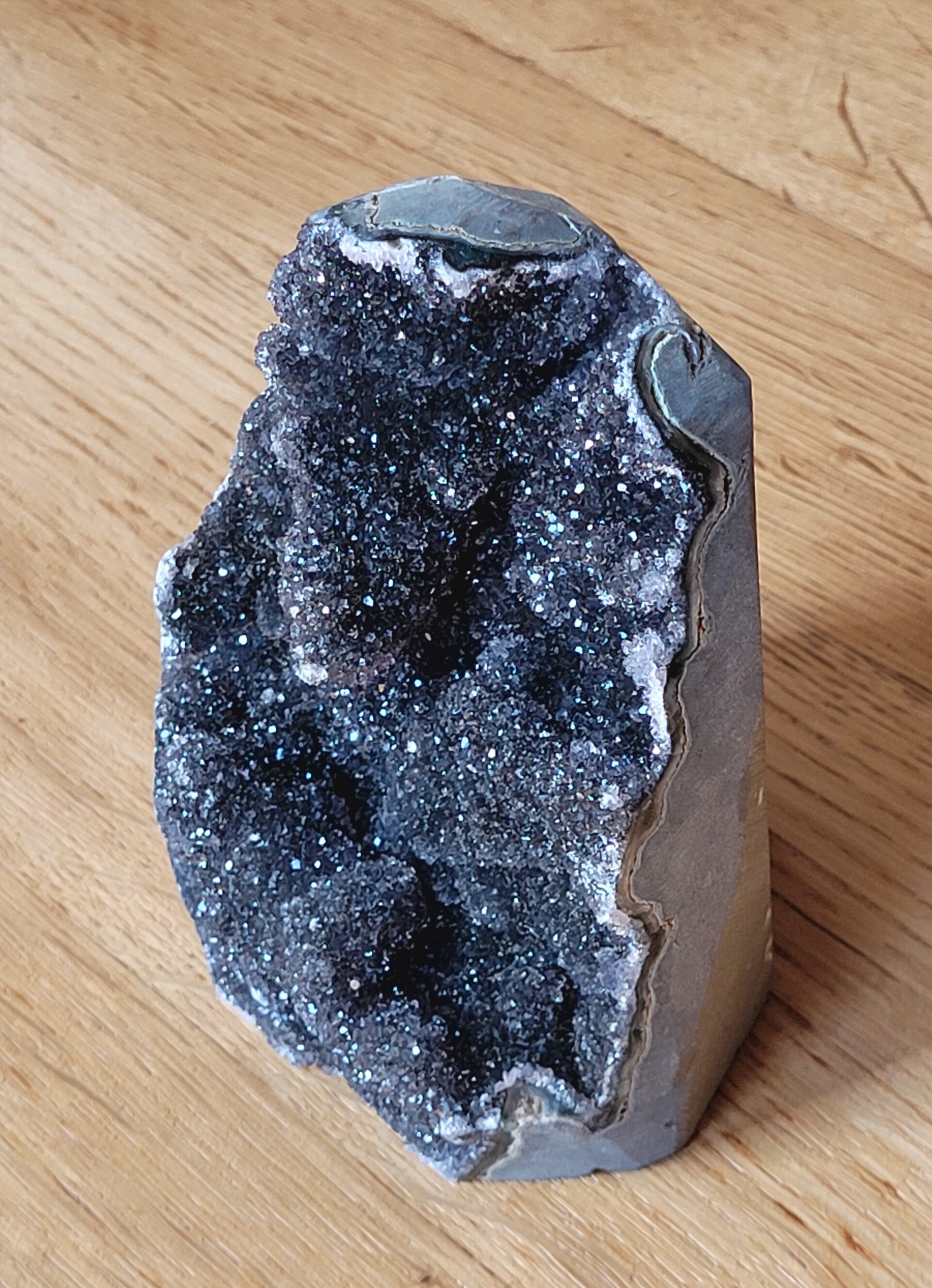Letterlijk schitterende standup Zwarte Amethist. De donkerste vorm van Amethist. Standup is uitgezaagd uit moedergesteente met gepolijst randje.