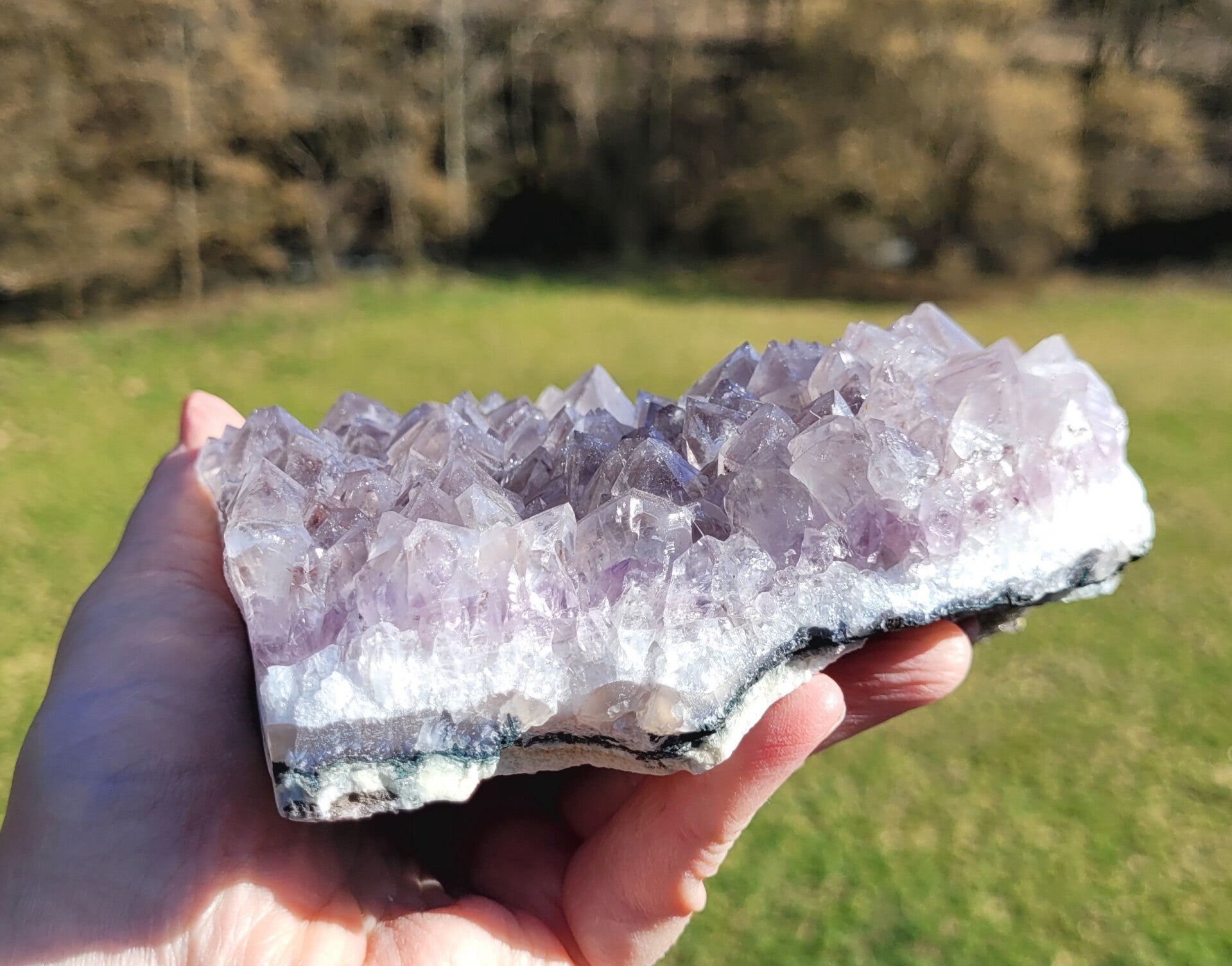 Zelfstaande brok ruwe Amethist, is gelijmd. Als ie staat zie je dat niet. Vandaar prijs. Zie foto's.