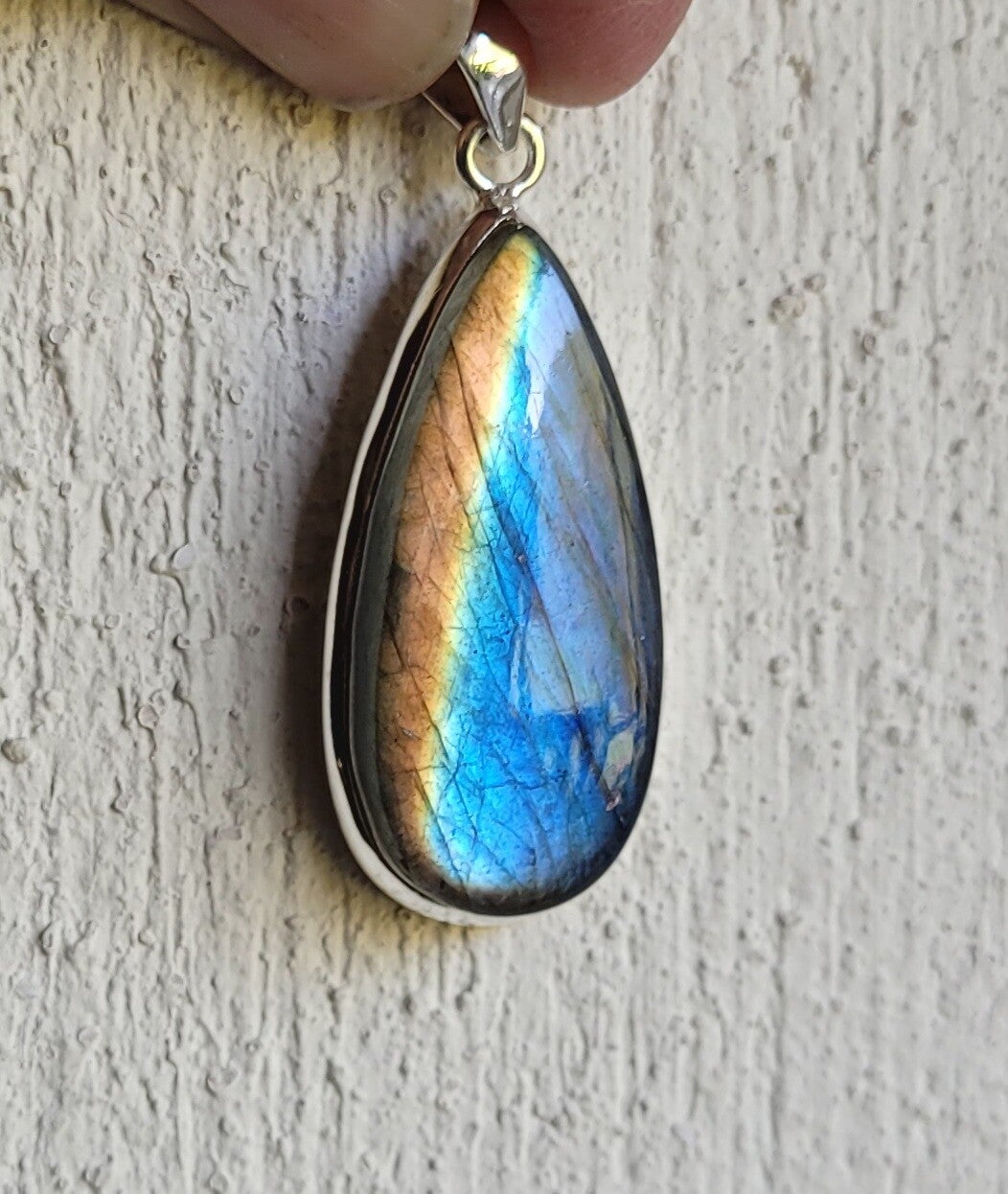 Silver pendant drop Superflash Labradorite gery thick stone.
