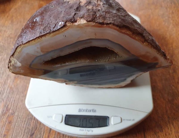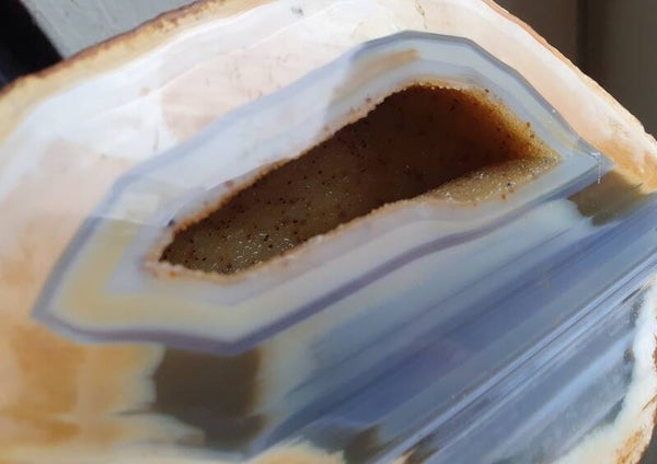 Mooie halve agaat knol met geode met kleine gele kwartskristallen.