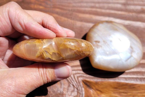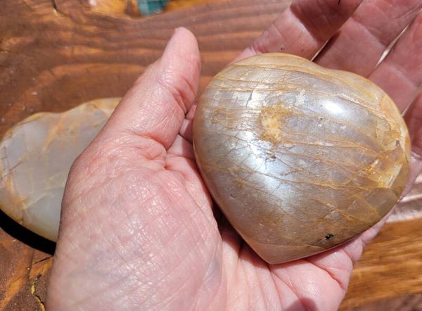 Mooie harten flash Maansteen. Oranje Maansteen met blauwzilvergrijze flash.