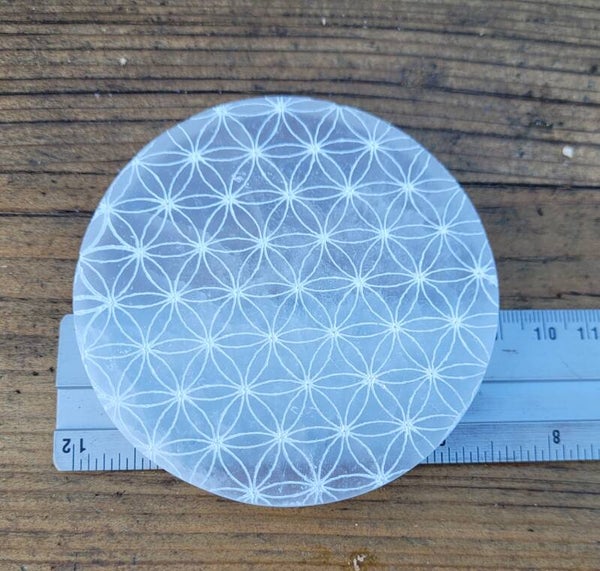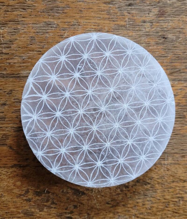 Mooie schijf, onderzetter Seleniet, satijnspaat met flower of life gravering.