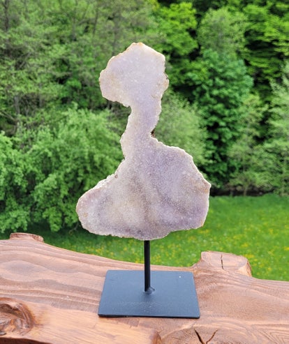 Mooie eenzijdig geslepen sculptuur Roze Amethist, Pink Amethyst op metaal standaard.