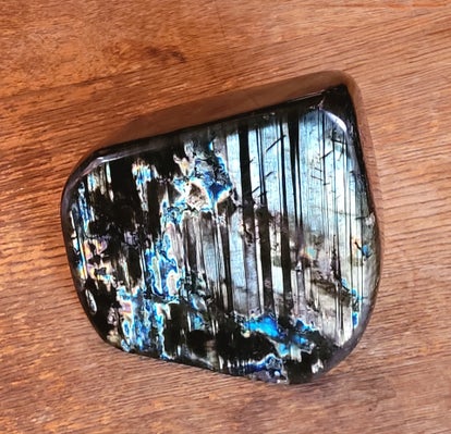 Prachtige sculptuur Labradoriet met erg mooie intens blauwe flash. Madagaskar. Super kwaliteit.